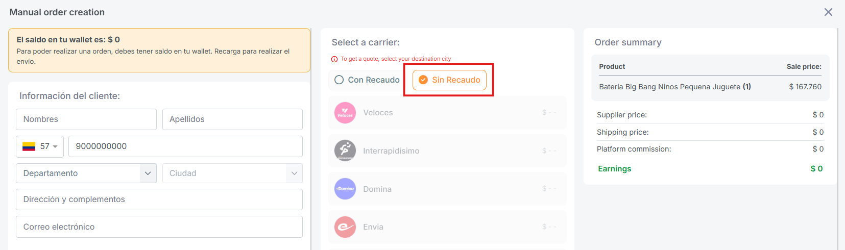 Lembre-se que para processar pedidos ''sin recaudo (sem cobrança) é necessário que você tenha o valor do custo do produto e o frete disponível em sua wallet.