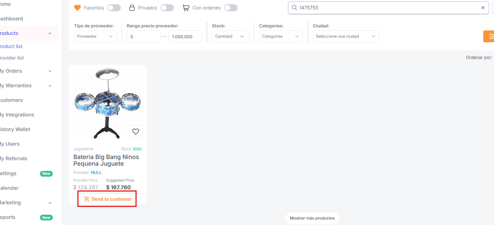Após encontrar o produto desejado, clique em "Send to customer", conforme ilustrado no exemplo abaixo.