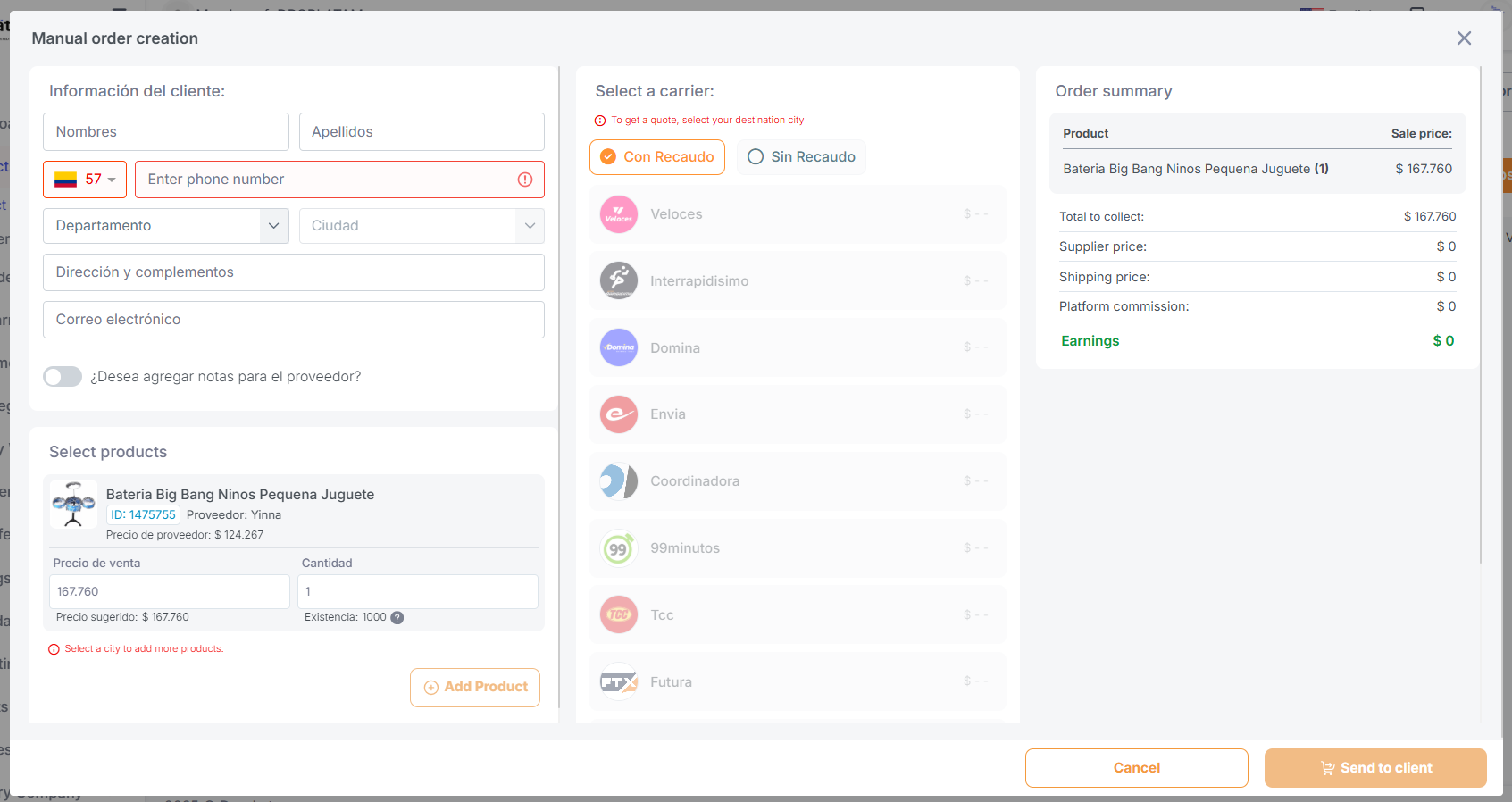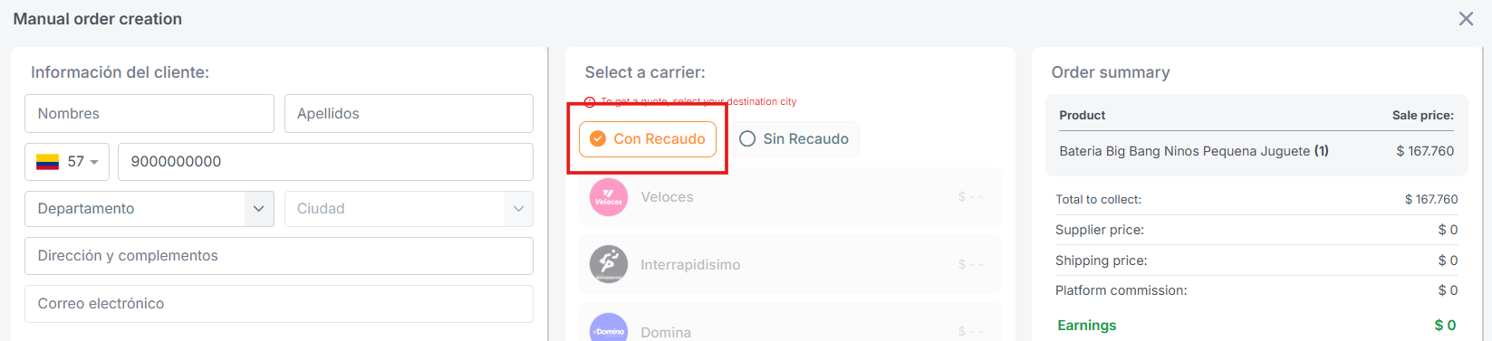 - Ao cadastrar o pedido manualmente, certifique-se de que a opção "Con Recaudo" esteja selecionada. Essa opção permite que o pagamento seja feito pelo cliente no momento da entrega.