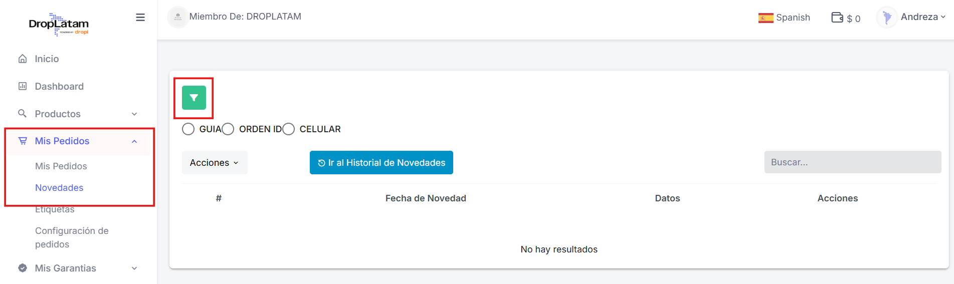 - Na plataforma DropLatam, acesse a seção "Novedades" em ''Mis Pedidos'' no menu principal.
