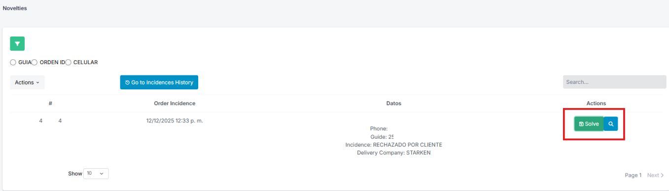 - Localize a novedad e clique no botão verde para abrir os detalhes.