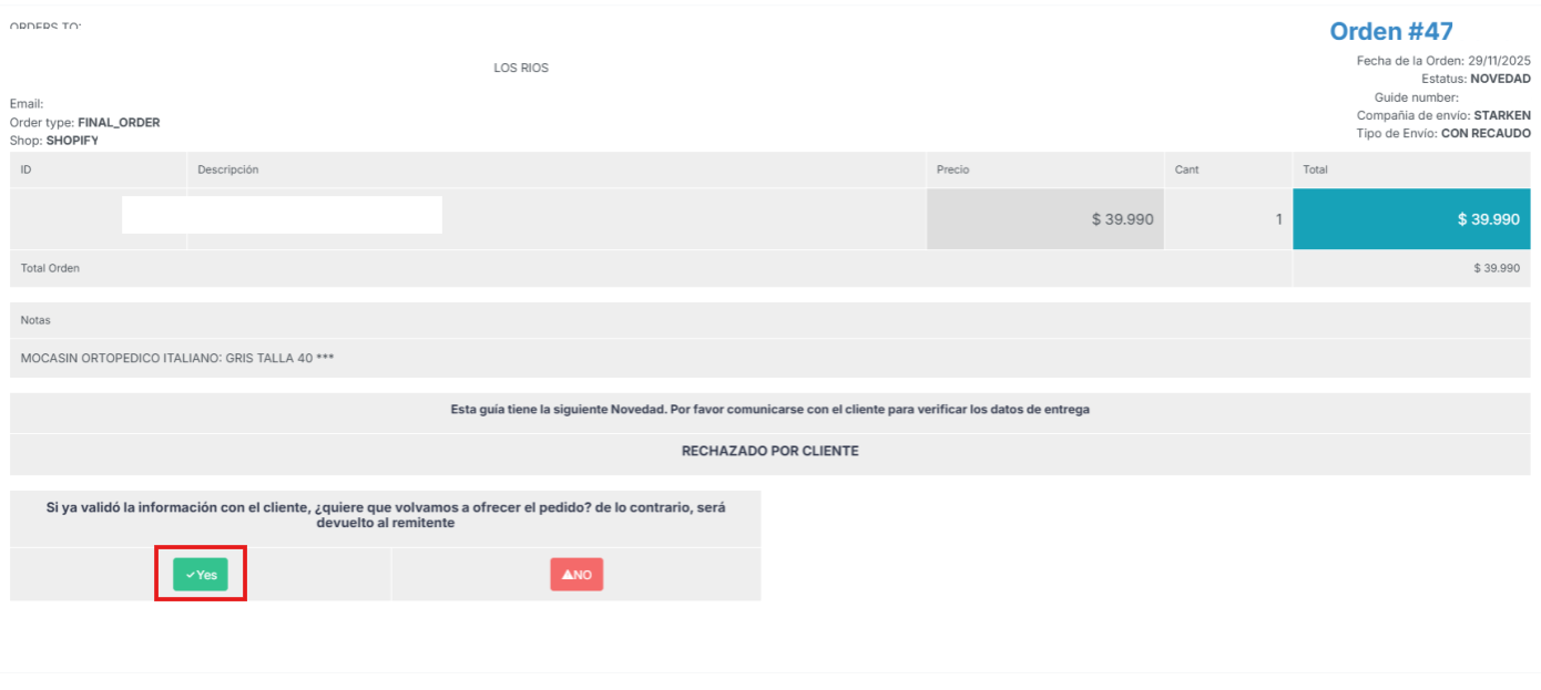 Sempre que um pedido não é entregue — seja por desencontro entre o cliente e a transportadora, endereço incorreto ou recusa do cliente em receber o produto — a plataforma abrirá uma novedad, para a qual você deverá apresentar uma resolução dentro de 24 horas.
