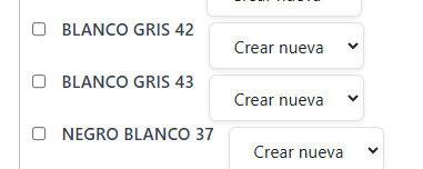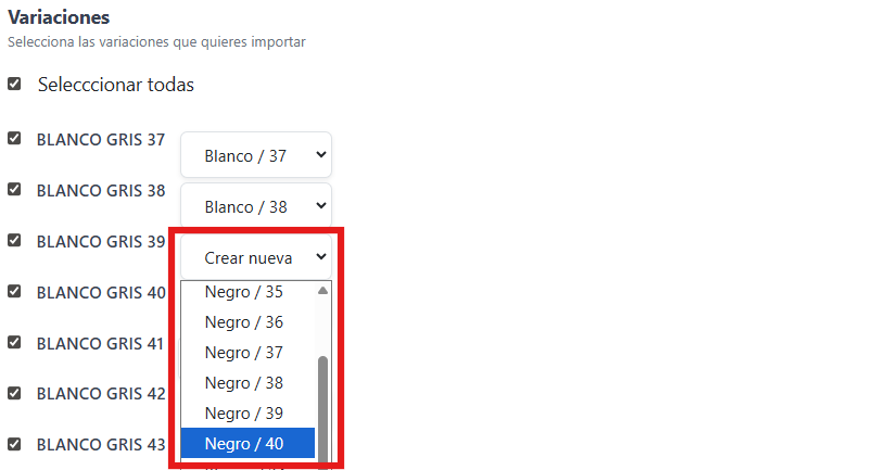 Selecione as variantes do novo produto que deseja importar