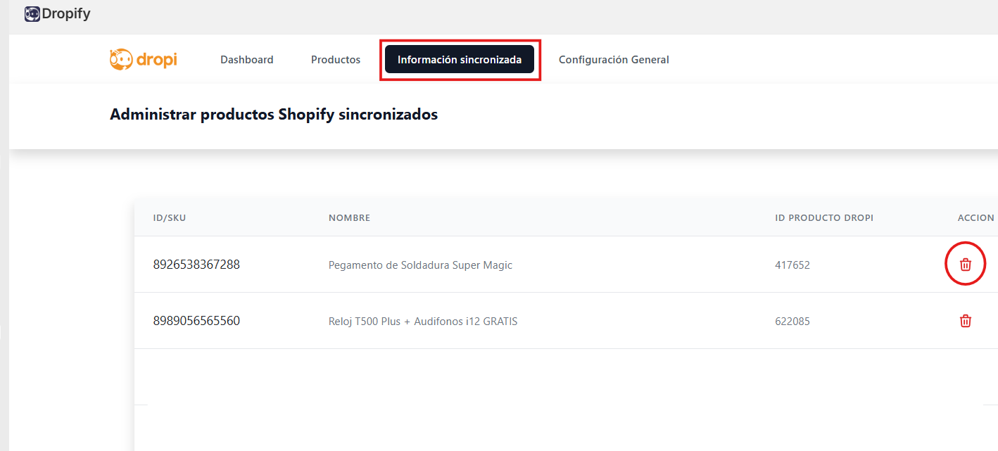 Clique no ícone da lixeira (na coluna “Acción”) para excluir a sincronização