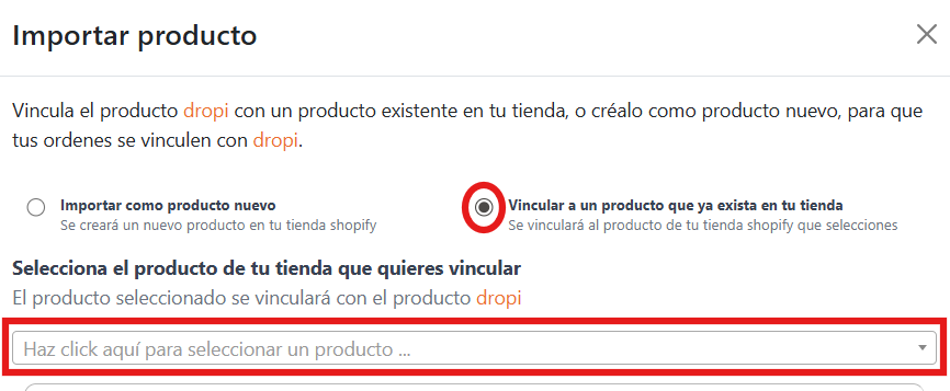 No campo de busca que aparece com o texto “haz click aquí para seleccionar un producto”, localize o produto que você já possui na loja e que deseja manter