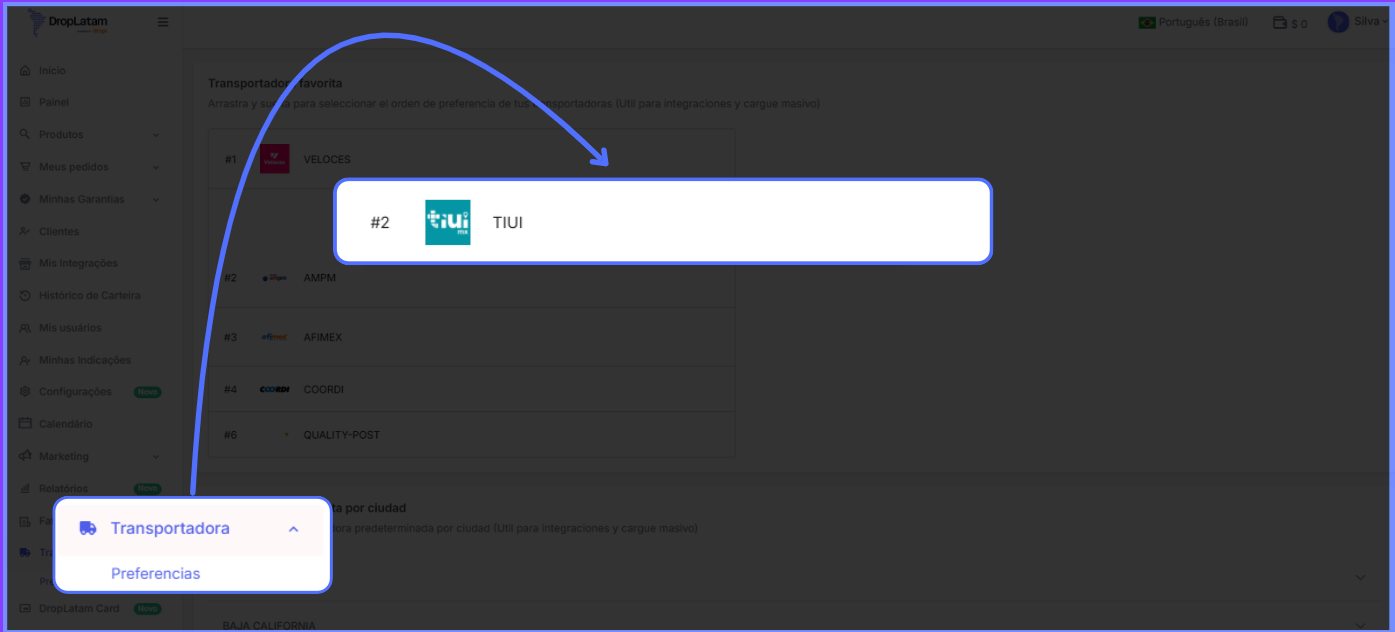 O processo para modificar a ordem das transportadoras na plataforma é simples. Siga os passos abaixo: