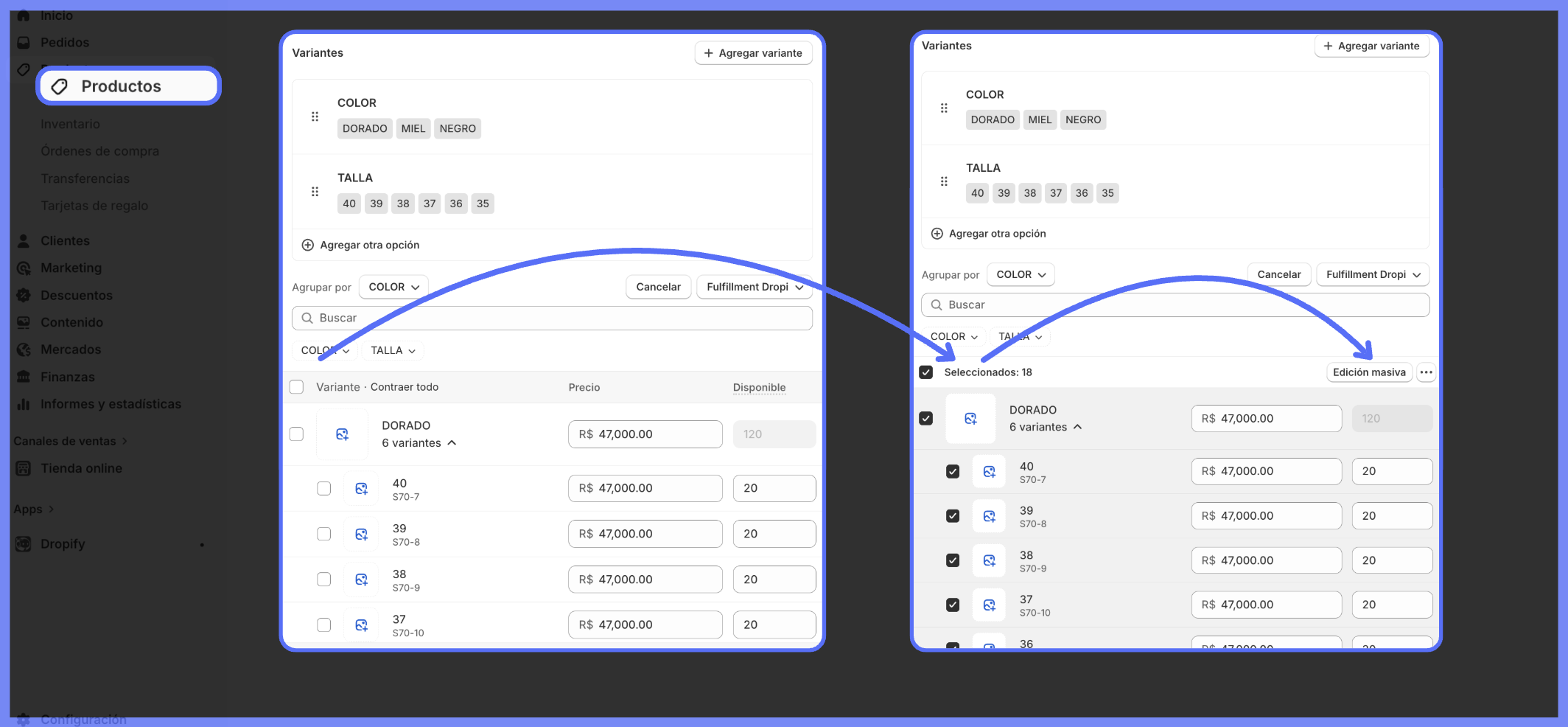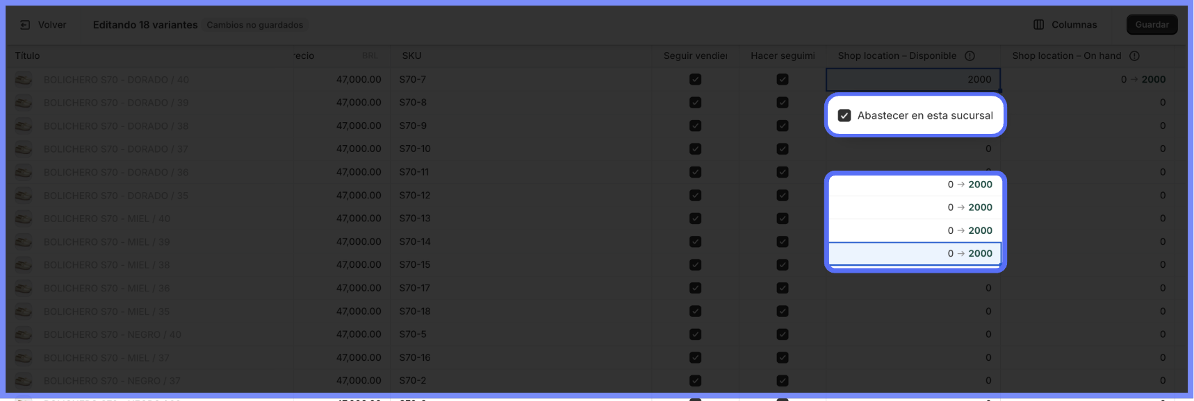 Em "Disponible", selecione "Estocar neste local", adicione um número de estoque e aplique para todas as variantes (basta selecionar a célula qual deseja copiar o número e arrastar para as células abaixo).