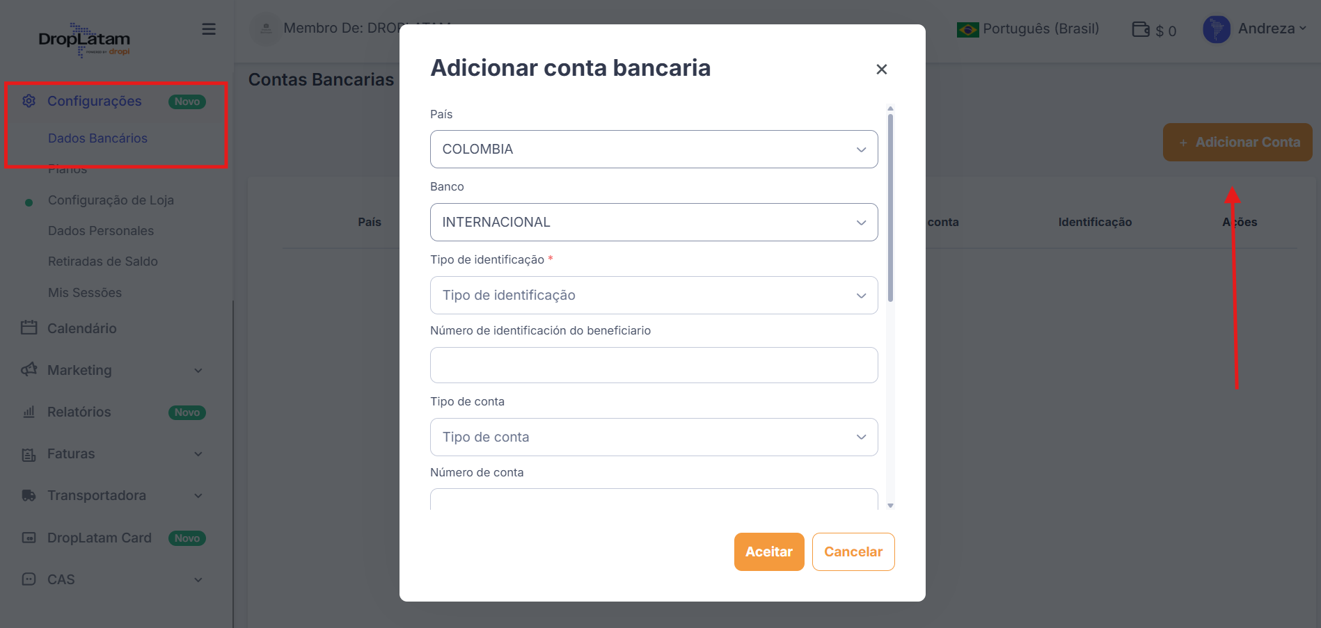 Cadastro de conta bancária tradicional para saques
