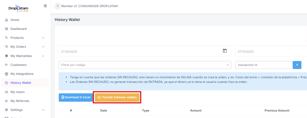 - Dentro da plataforma DropLatam, localize a aba "History Wallet" e clique.