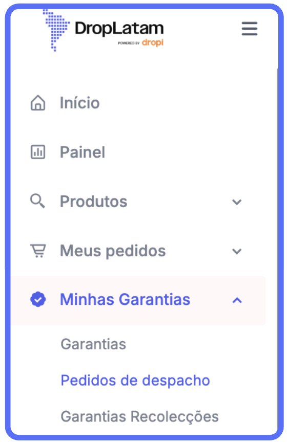 Você pode acompanhar as garantias pendentes, aprovadas, guias de coleta e despacho no menu "Minhas garantias" na plataforma DropLatam.