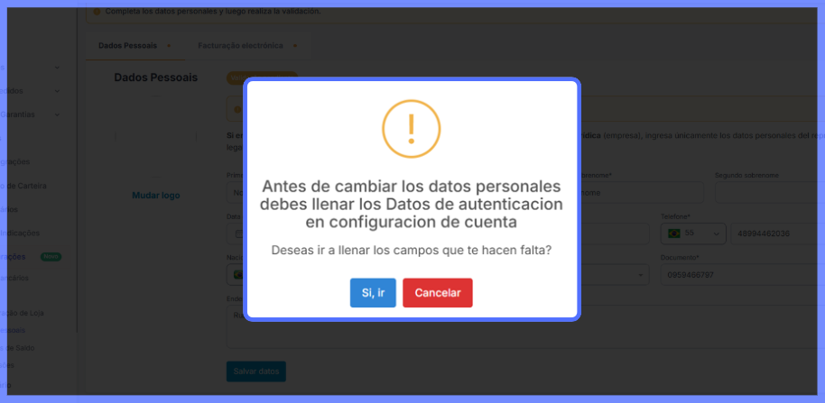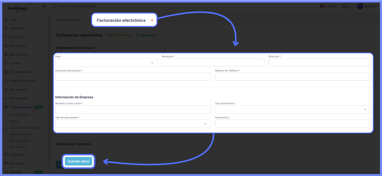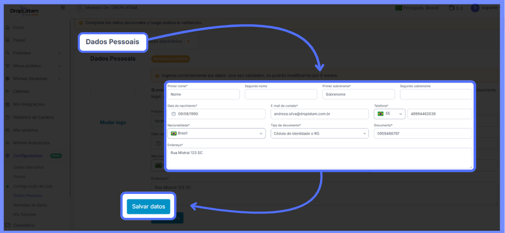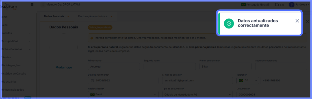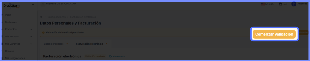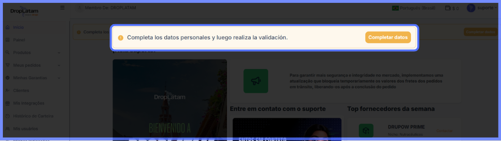 Por onde começo a validação? Ao acessar a plataforma DropLatam, uma mensagem em amarelo será exibida no topo da página. Clique em "Completar dados" para iniciar o processo — você será redirecionado ao espaço Datos Personales e Facturación.