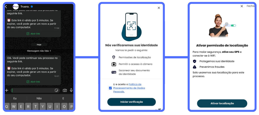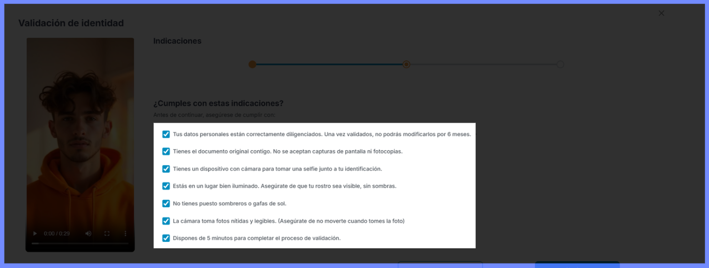 - Aceite os termos de política de processamento de dados pessoais e clique em "Iniciar verificación" Caso solicitado, ative a câmera e a localização do dispositivo — essas permissões são obrigatórias para prosseguir