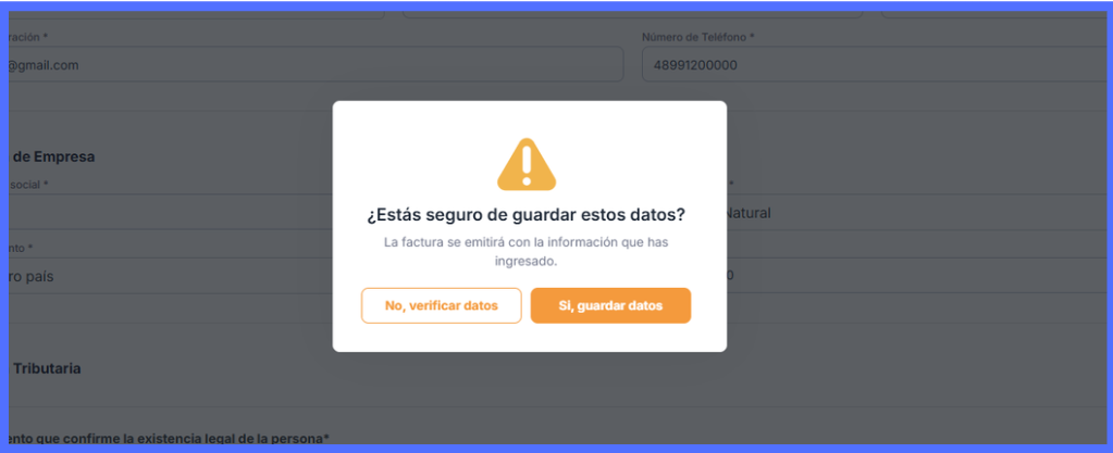 "No, verificar datos" — retorna para revisar as informações antes de confirmar