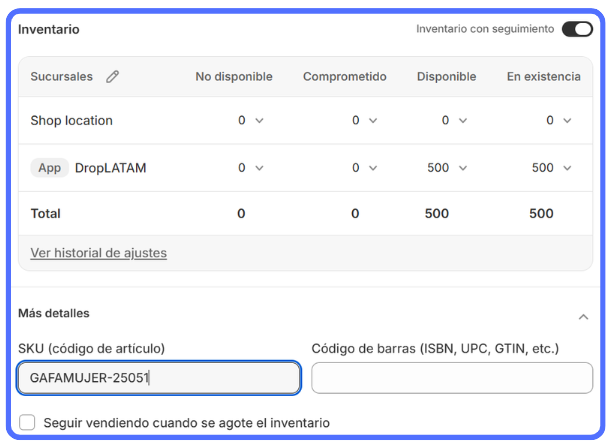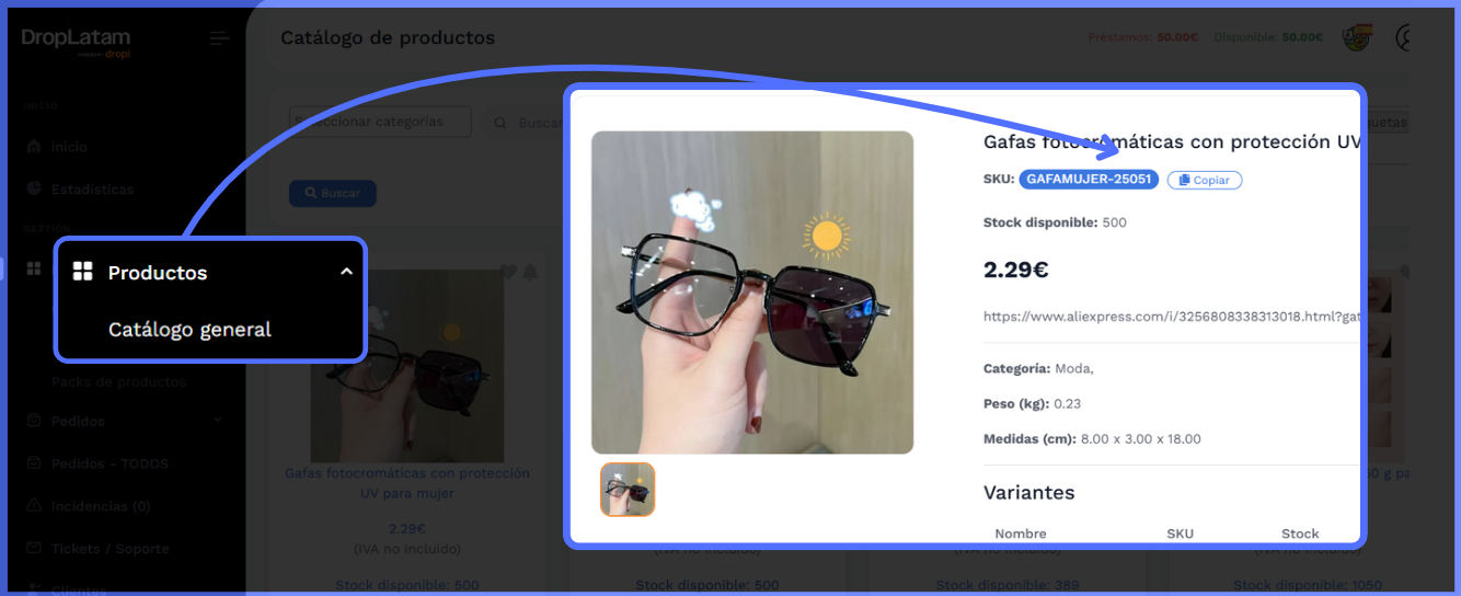 - Cole a SKU do produto correspondente na DropLatam Espanha