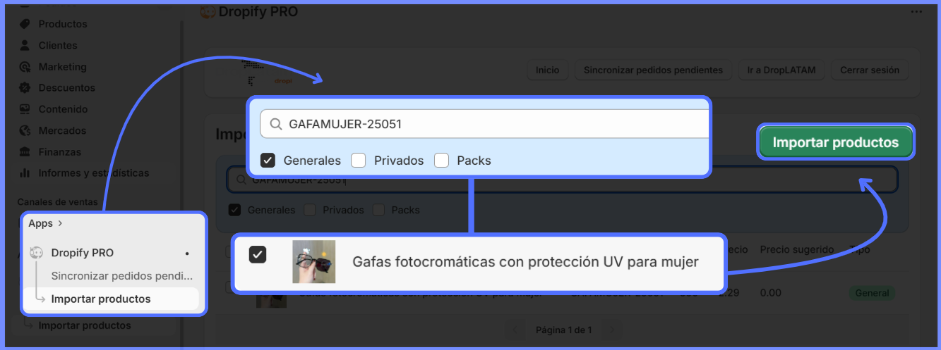 Pré-requisito Antes de importar produtos, certifique-se de que sua loja Shopify está integrada corretamente com a DropLatam Espanha.