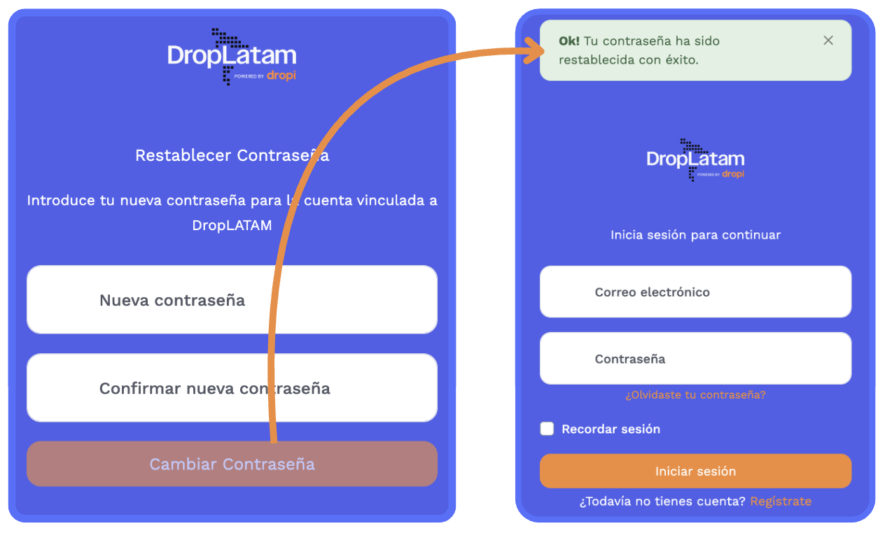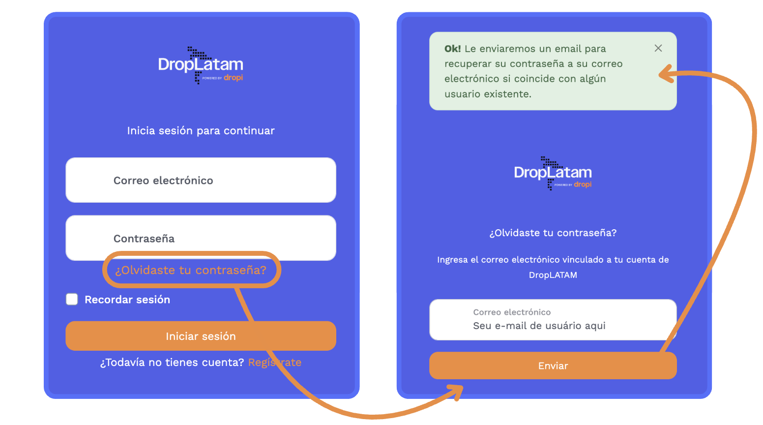 - Na página de acesso da DropLatam, clique em "Olvidaste tu contraseña?"