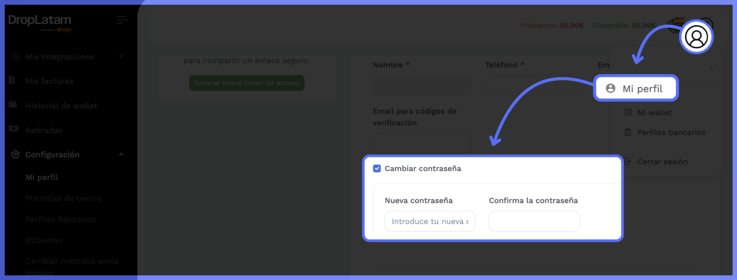 - Marque a caixinha ao lado de "Cambiar contraseña"