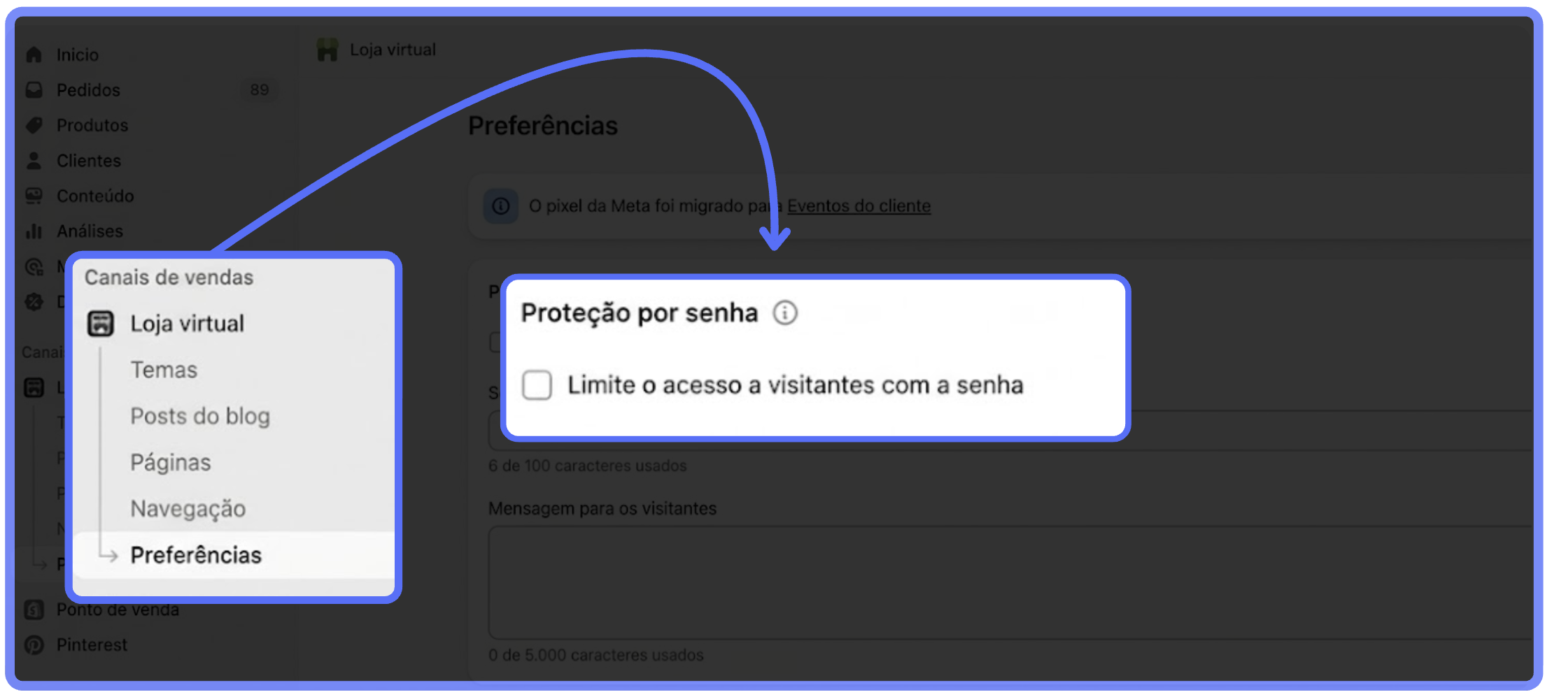 6. Remova a senha da loja Por padrão, a Shopify protege a loja com senha. Para torná-la pública: