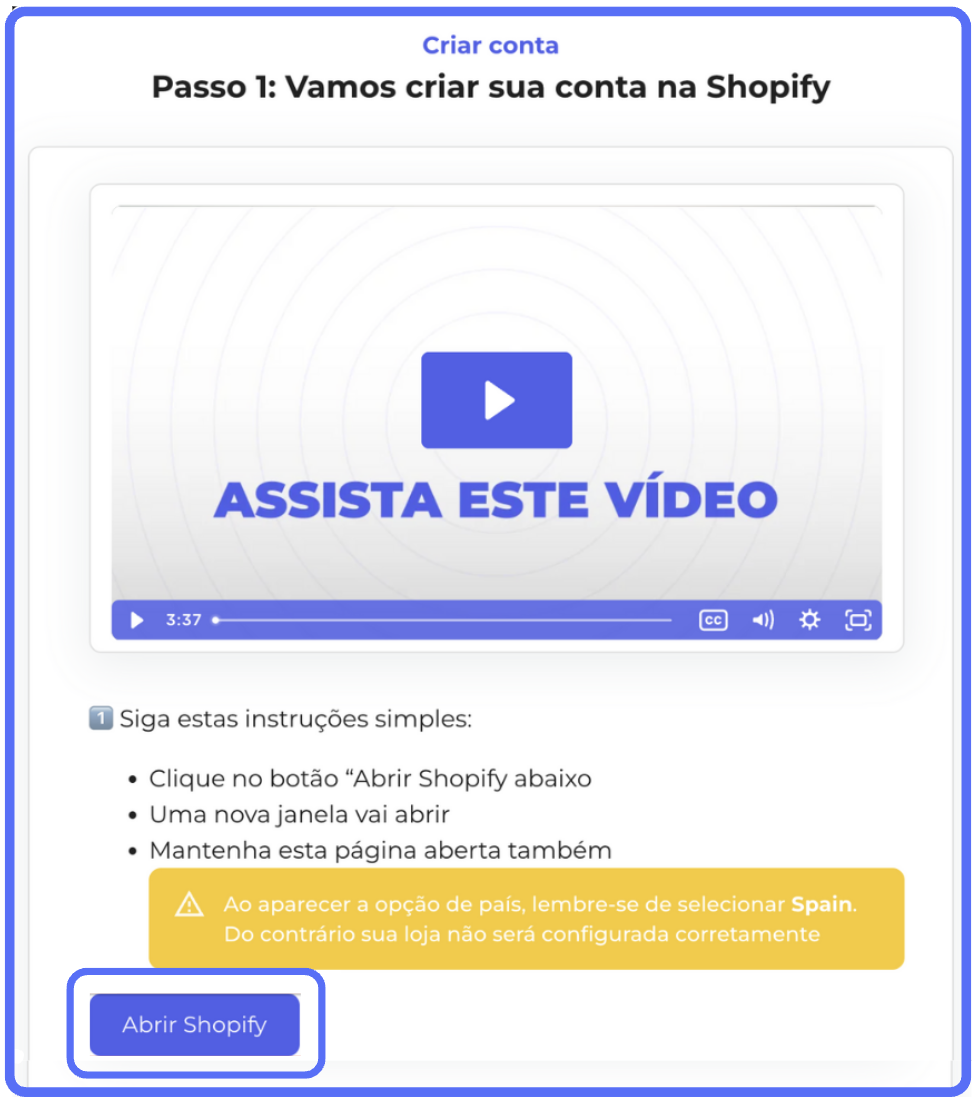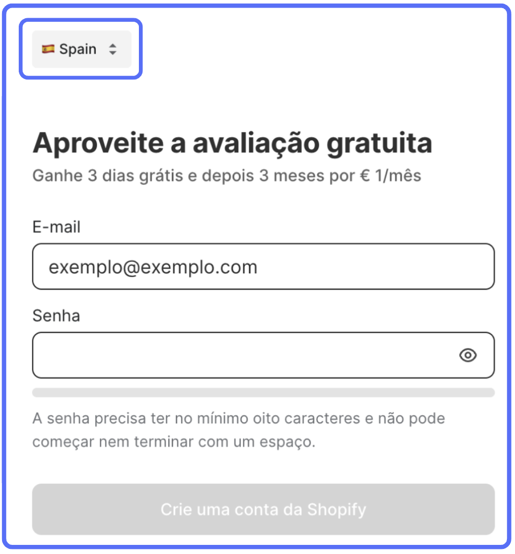 Como você irá iniciar o processo de criação de uma loja nova, não é possível utilizar um e-mail já cadastrado na Shopify