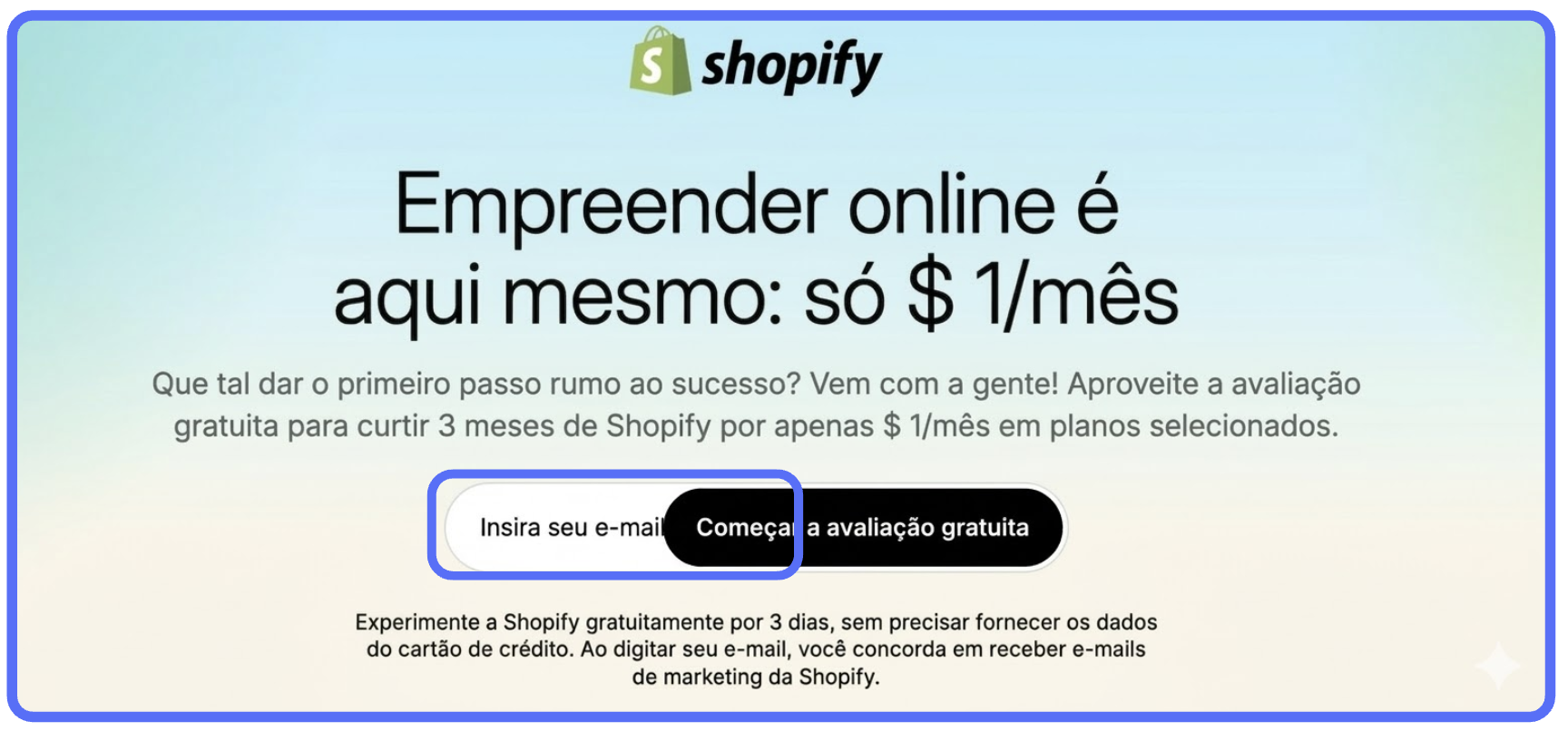 - Insira um e-mail que nunca tenha sido usado na Shopify e clique em "Começar Teste" (imagem 4)