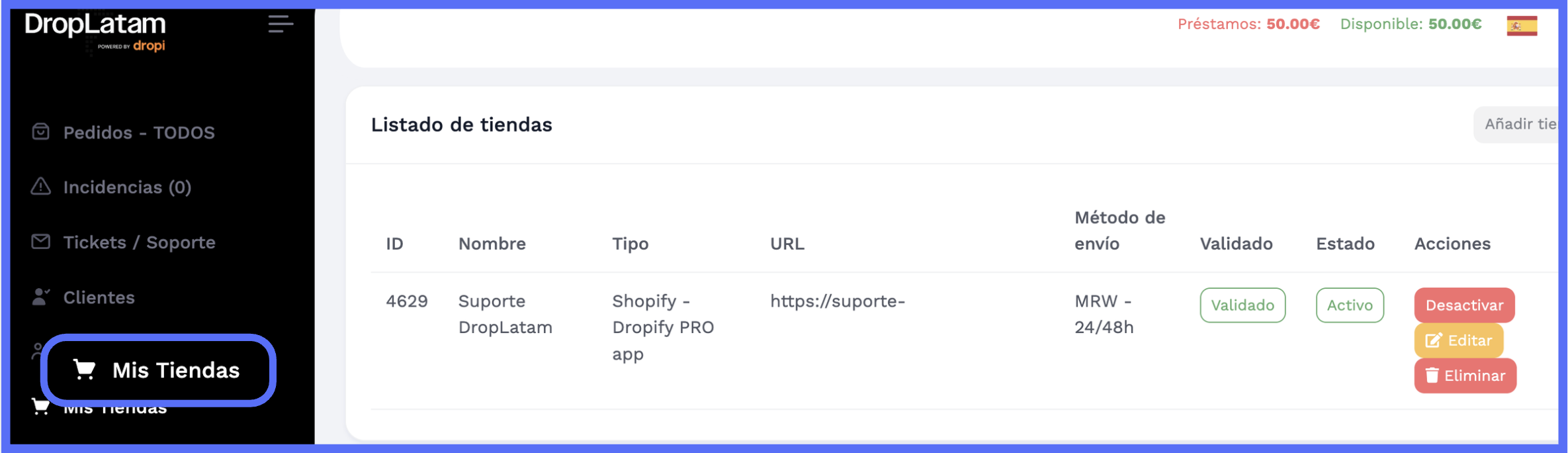 Em "Mis Tiendas" dentro do Dropify PRO, confirme se sua loja aparece listada