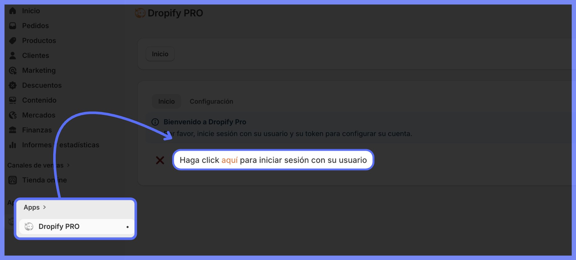 Após instalar o Dropify PRO, na página que abrir clique em "Haga click aquí"