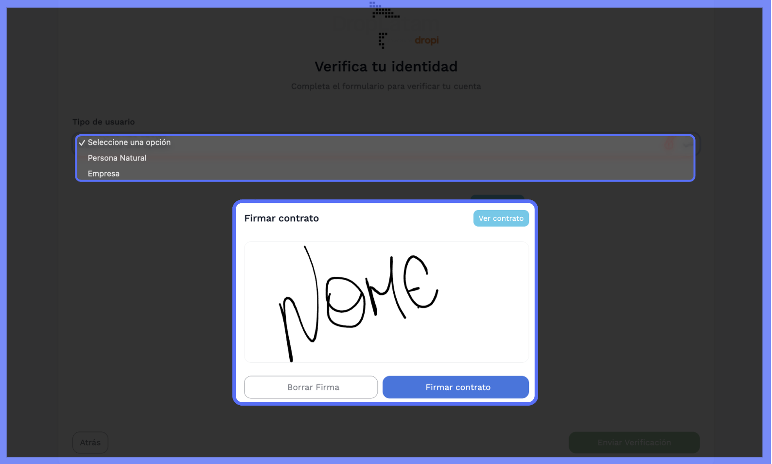 - Clique em "Firmar contrato" para enviar a assinatura, ou "Borrar firma" pra apagar e refazer a assinatura.