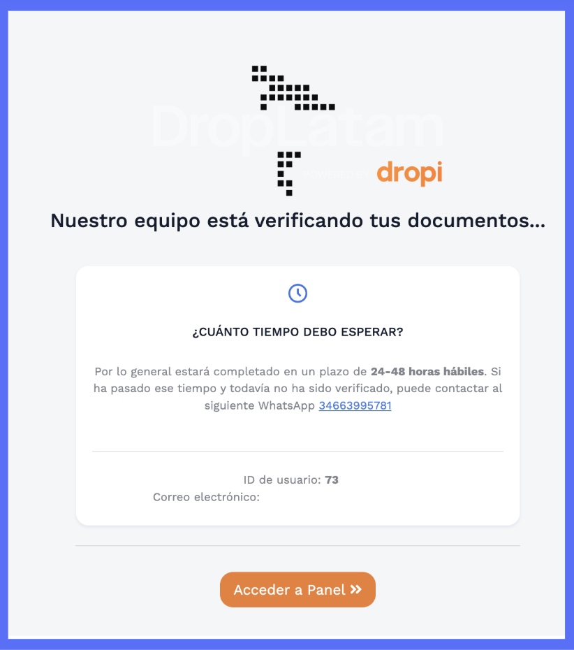 Preciso de suporte durante a validação. Com quem falar? Entre em contato com o suporte de validações da DropLatam Espanha pelo WhatsApp: +57 320 9463778 ou pelo número que aparece na tela (Imagem 4).