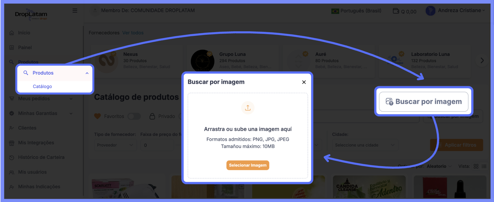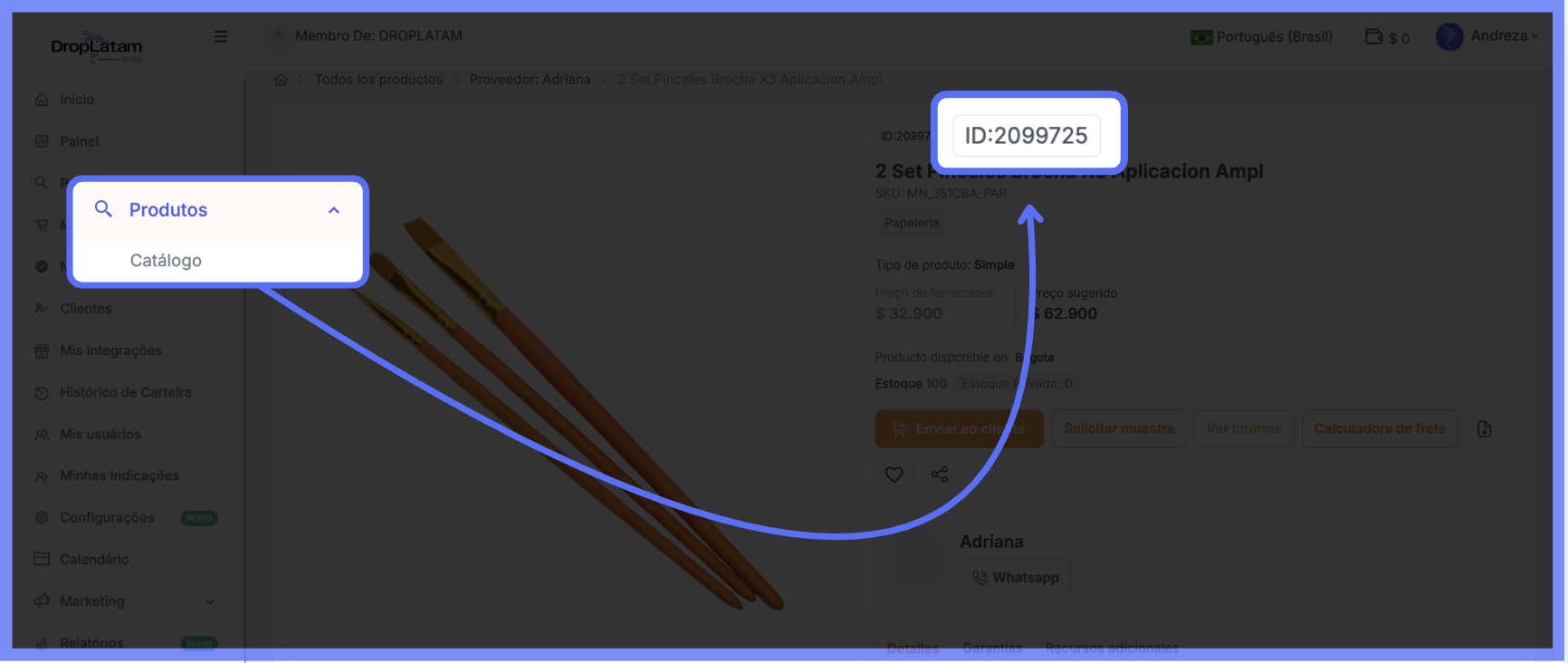 - Acesse Produtos > Catalogo na plataforma DropLatam