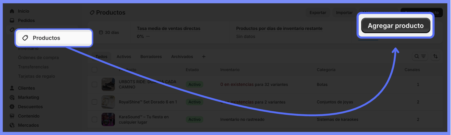 - Acesse a aba Productos