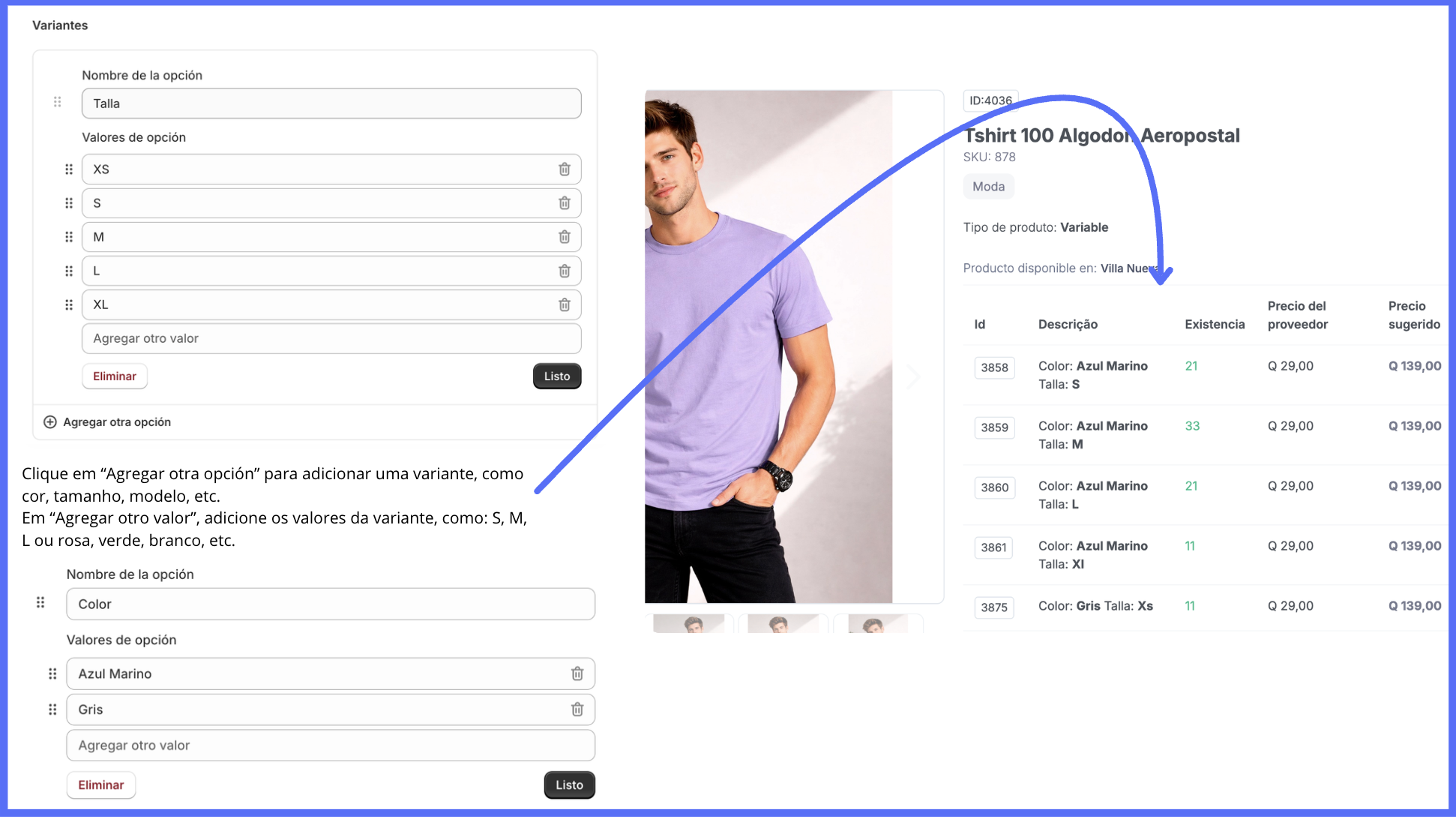 - Associe cada uma às variantes correspondentes já existentes no produto da loja