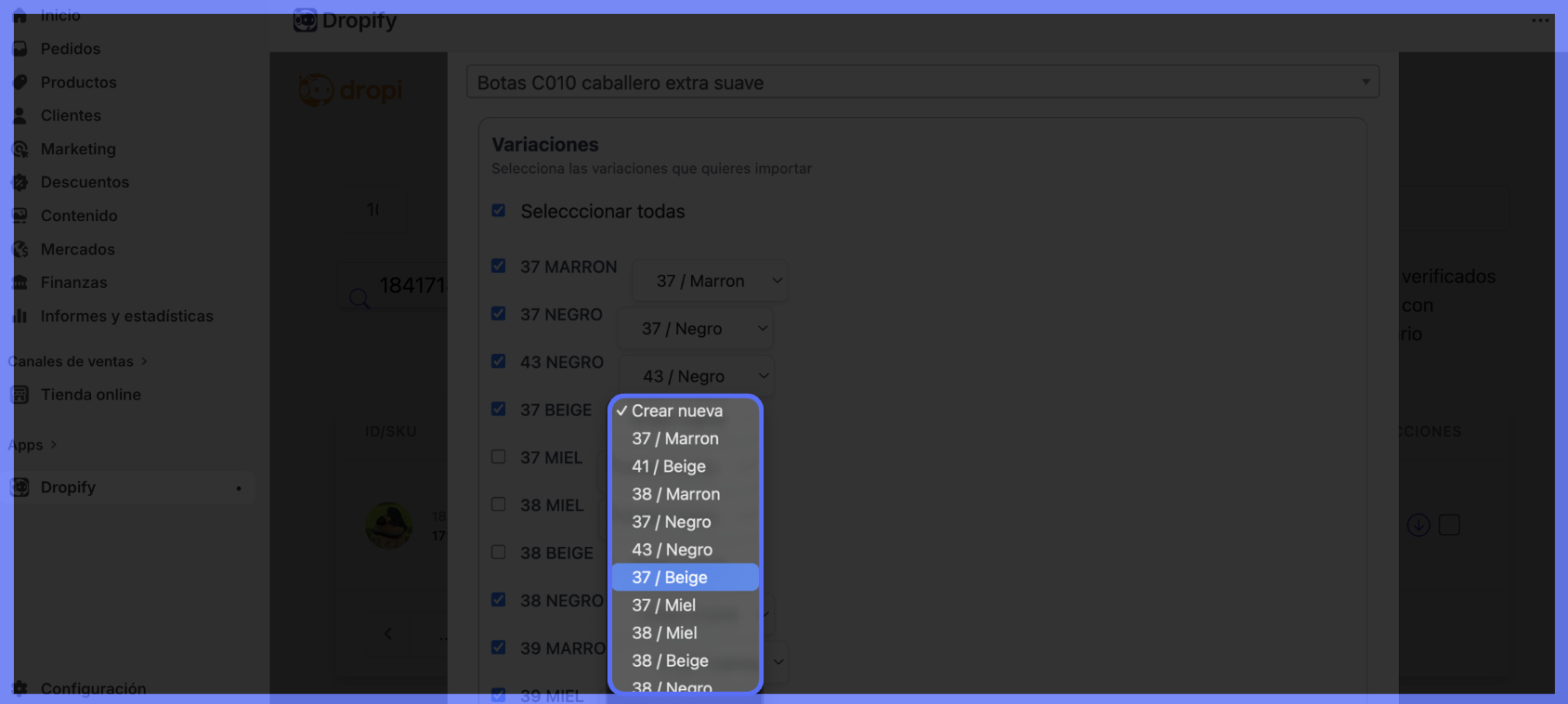 - Selecione as variantes do novo produto que deseja importar