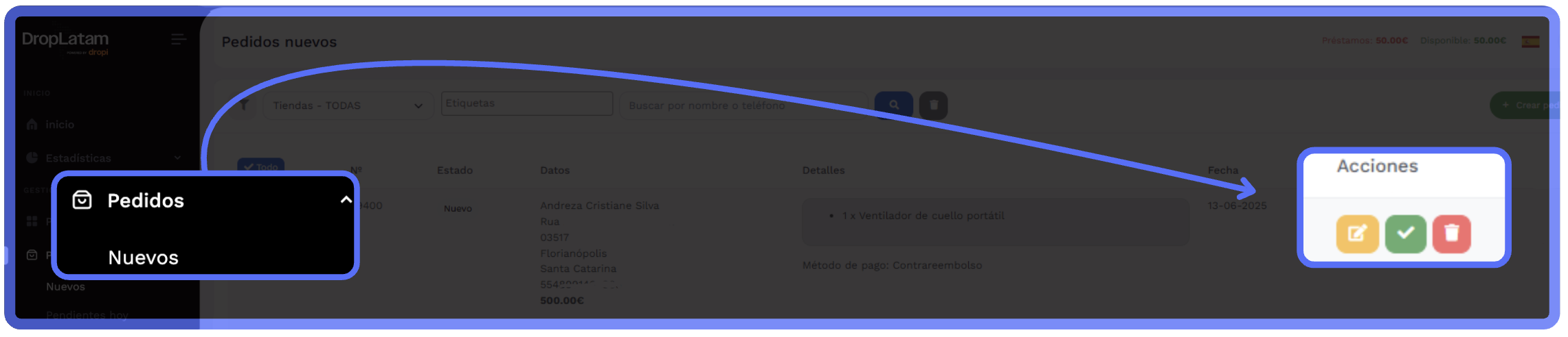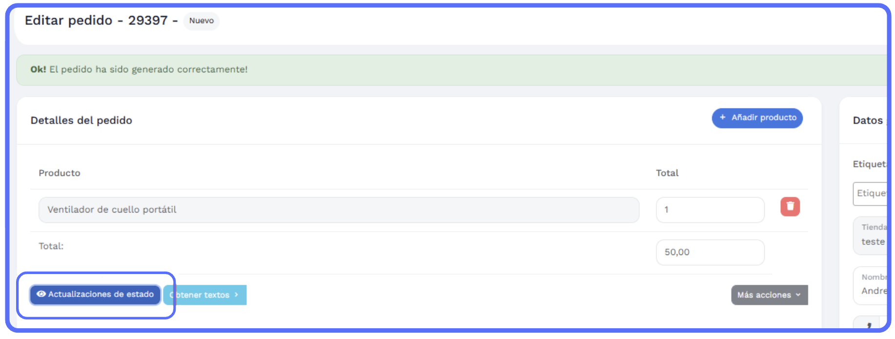 Acesse o pedido e clique em "Actualizaciones de estado"