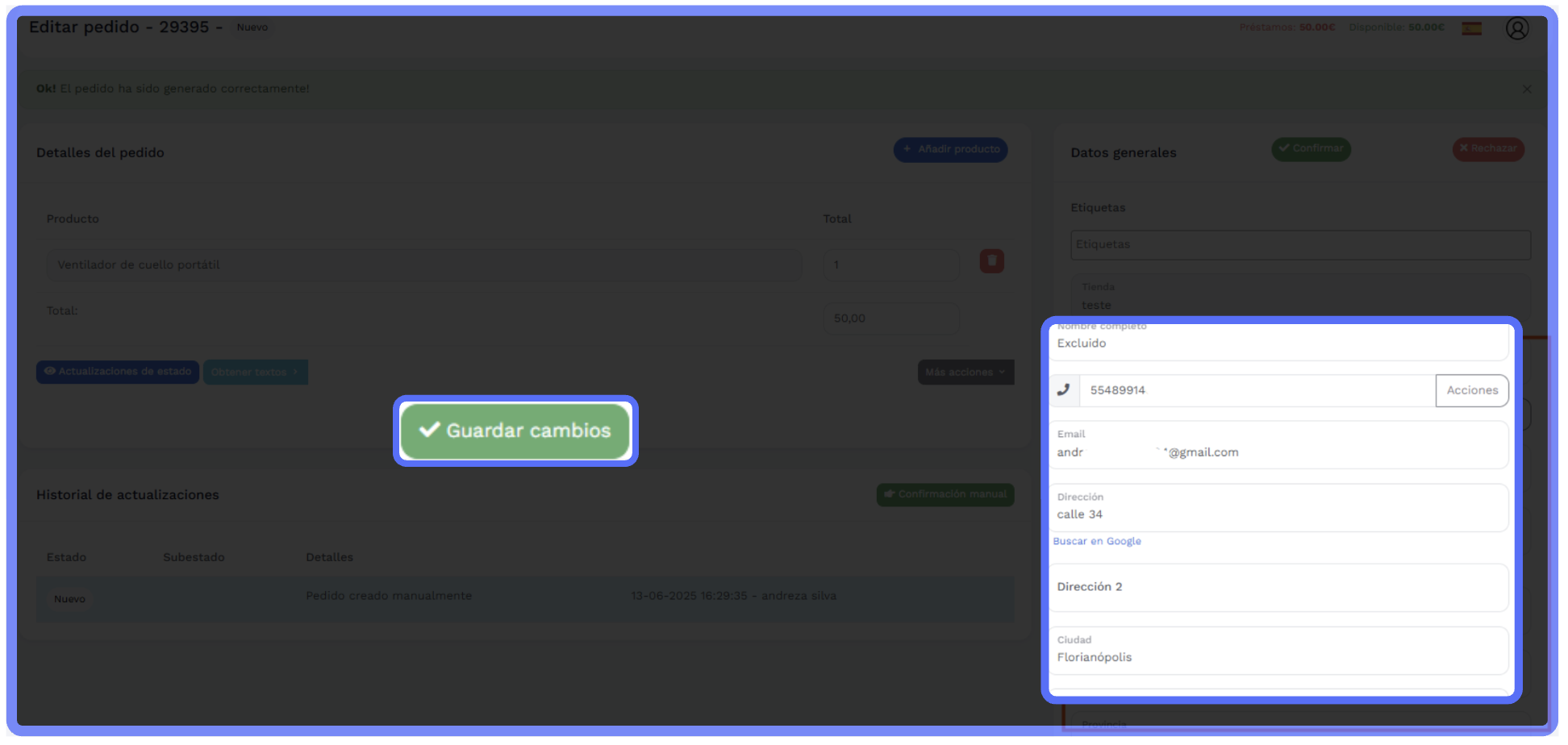 Clique em "Guardar cambios" — uma mensagem de confirmação será exibida