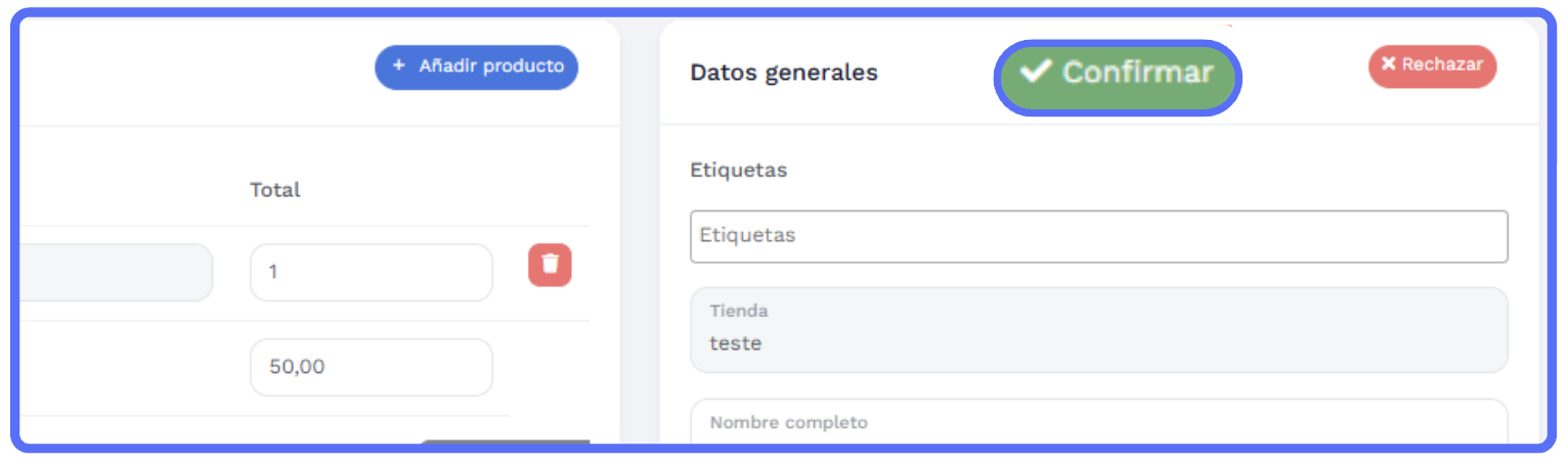 Clique em "Confirmar" no canto superior direito para reenviar o pedido