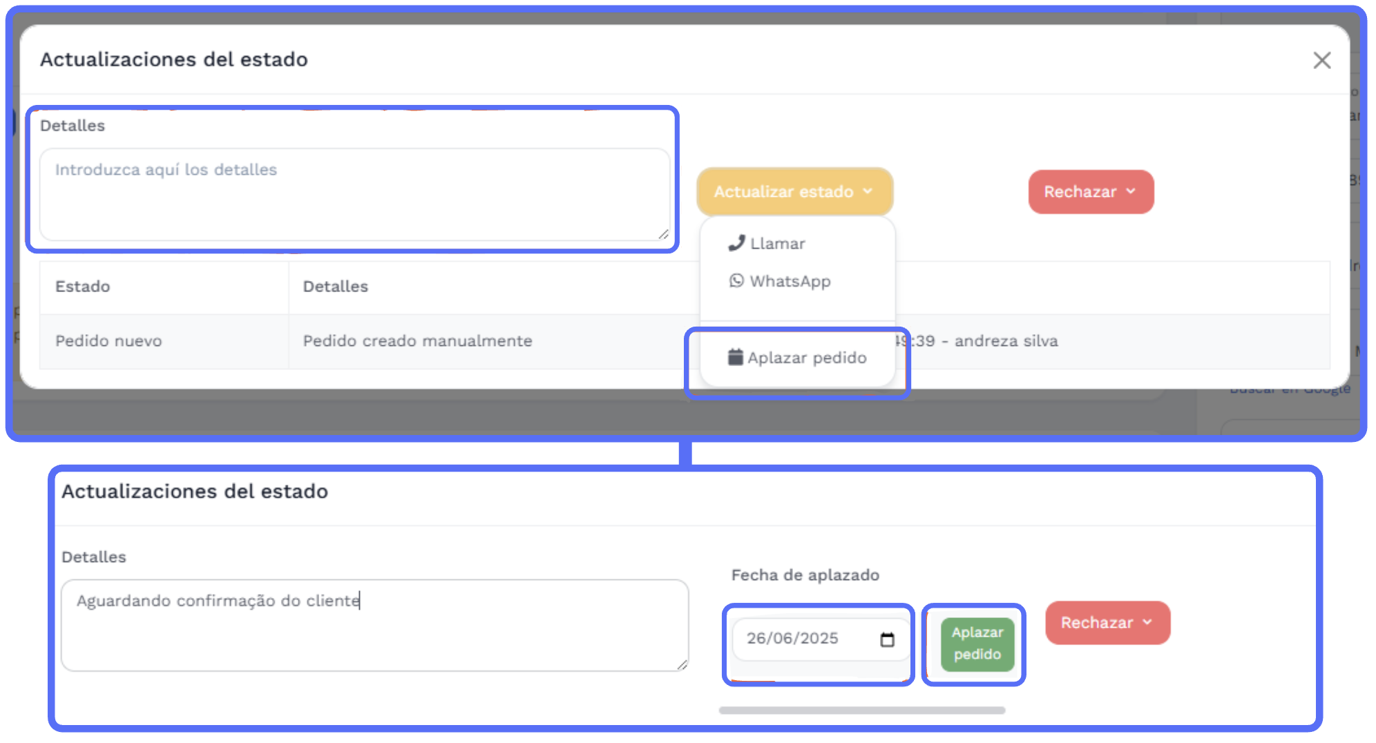 - Clique em "Actualizar estado" e selecione "Aplazar pedido"