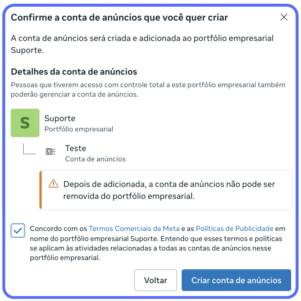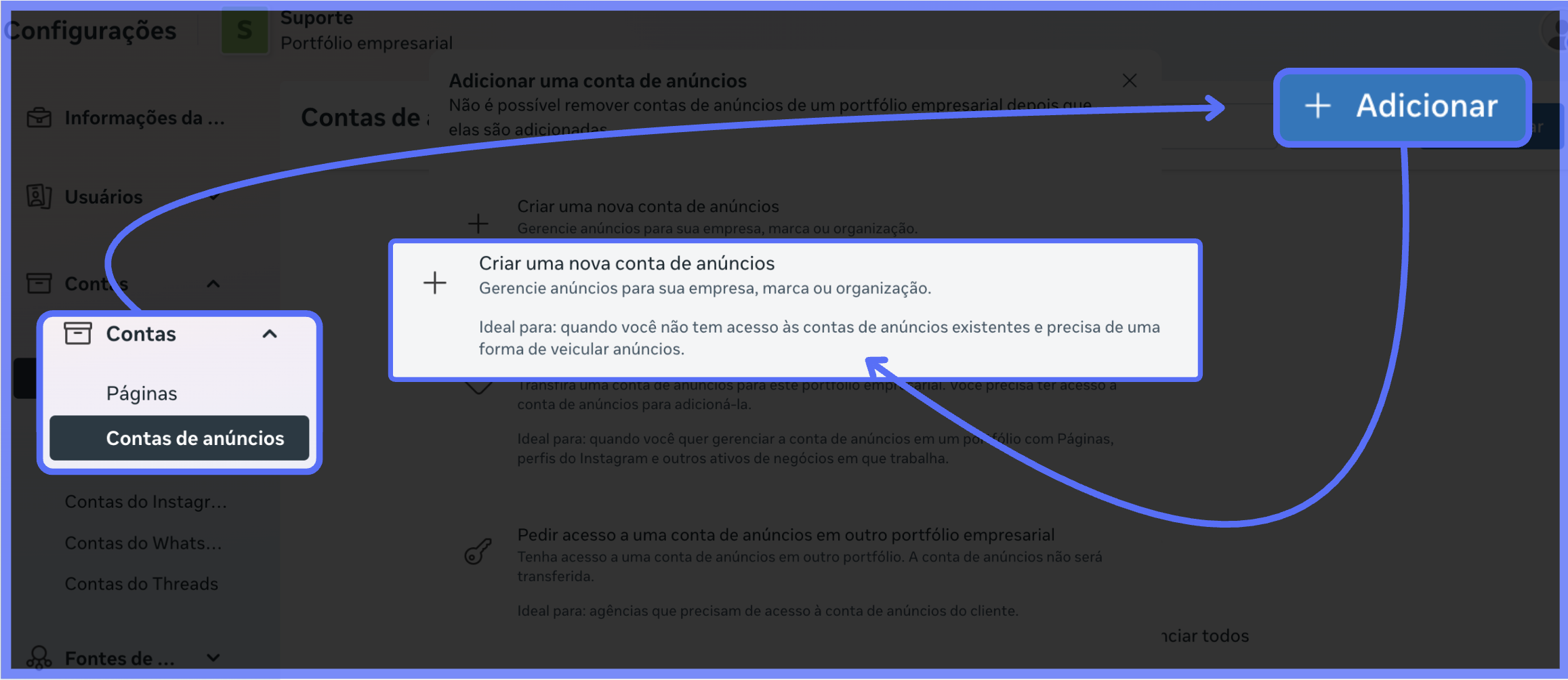 - Nas Configurações do negócio, acesse Contas > Contas de anúncios no menu lateral