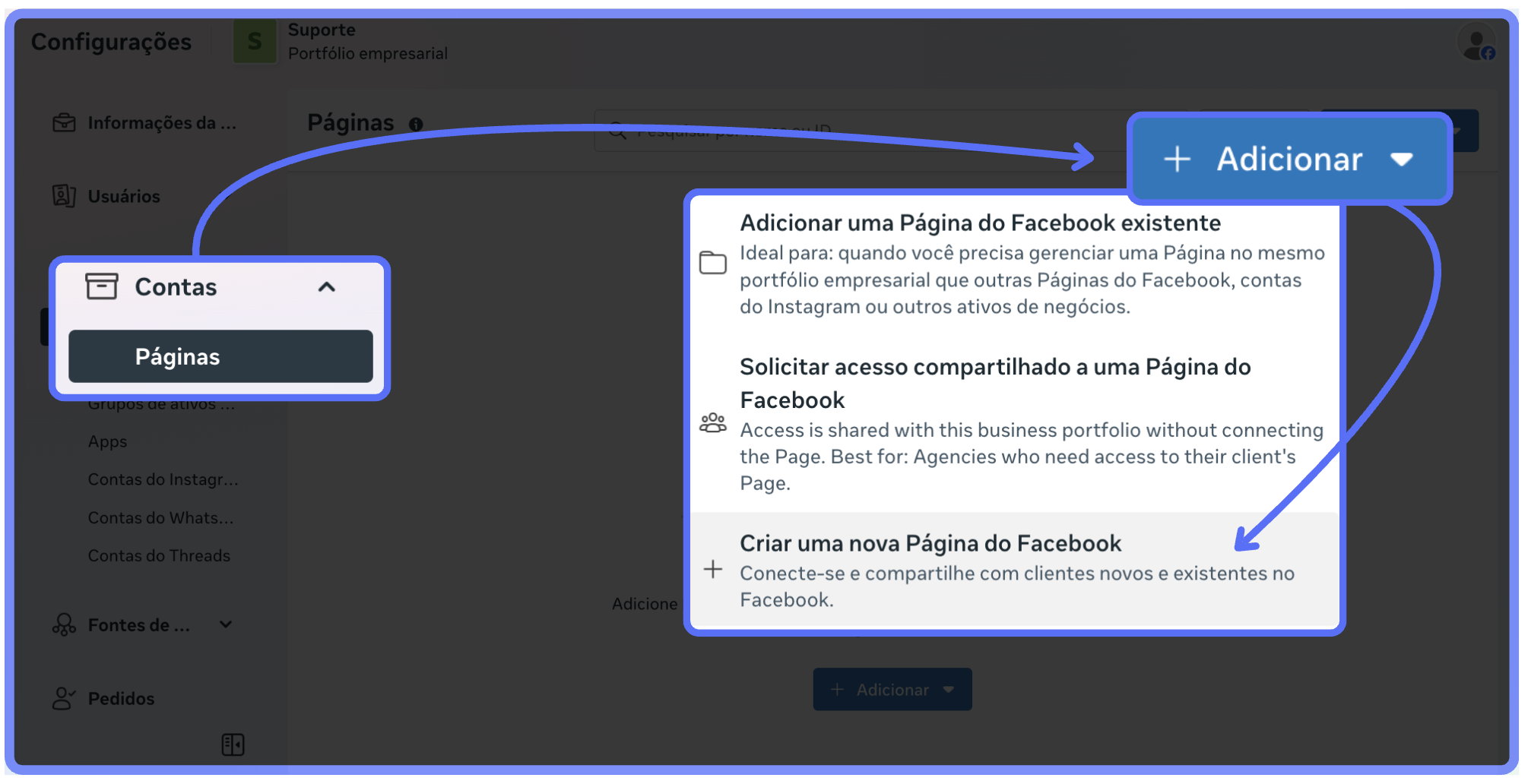 - Nas Configurações do negócio, acesse Contas > Páginas