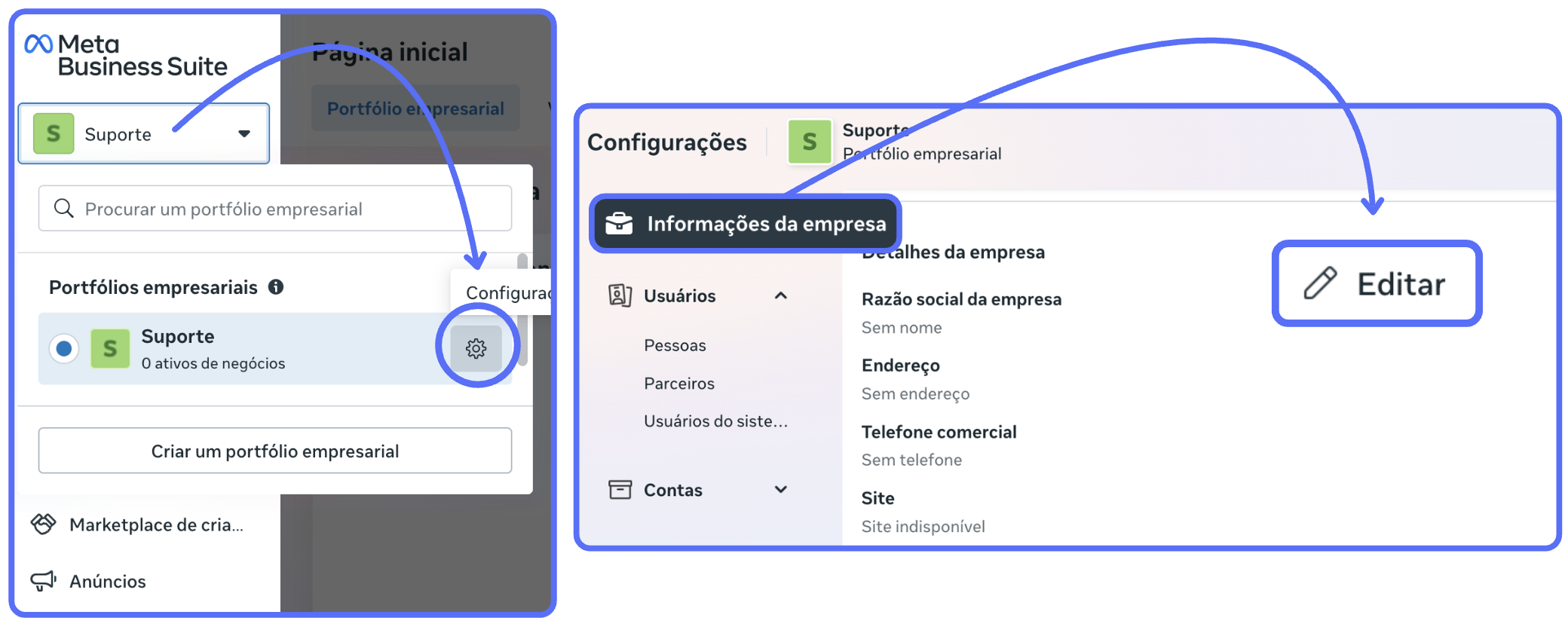 - Em business.facebook.com, clique no nome do seu portfólio no canto superior