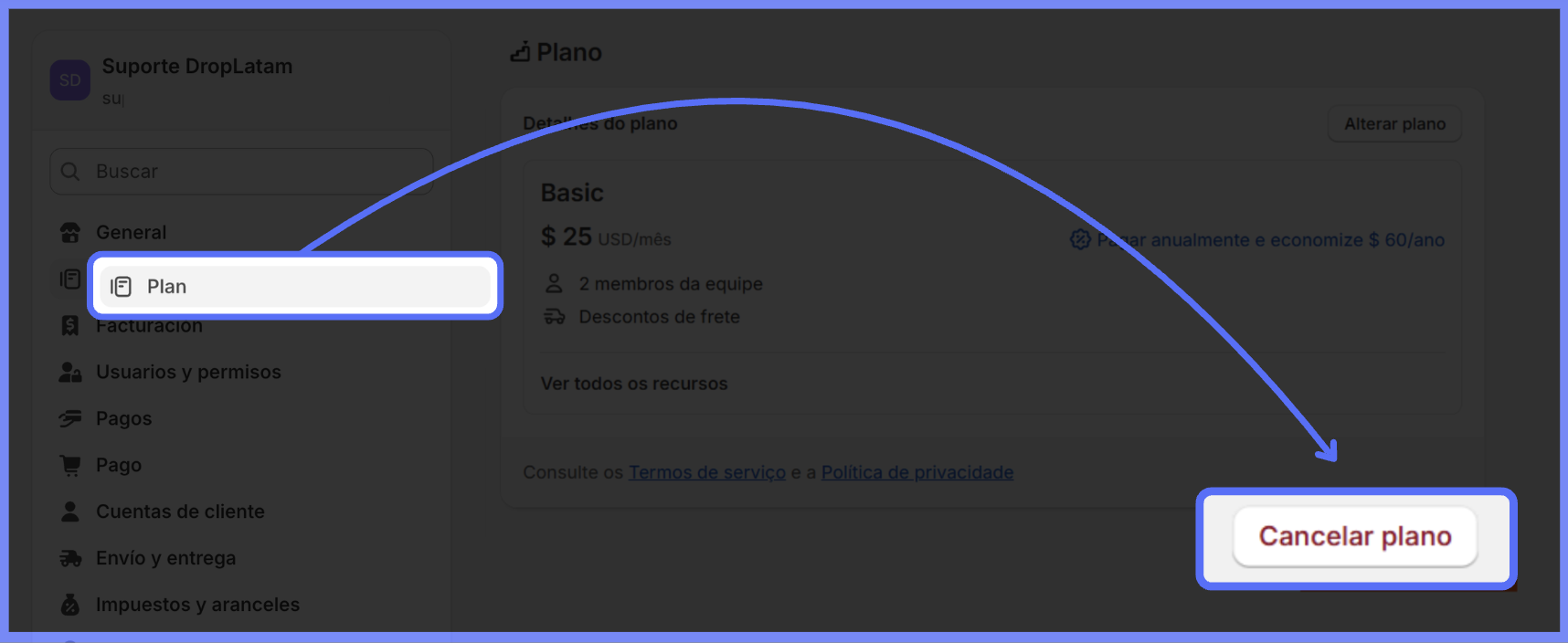 Quem pode cancelar o plano? Apenas o titular da loja pode realizar o cancelamento diretamente pelo painel administrativo da Shopify.