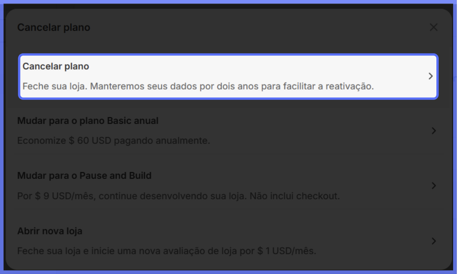 O que acontece com meus dados após o cancelamento? Suas informações financeiras e de pedidos ficam armazenadas na Shopify por até 2 anos, facilitando uma eventual reativação.