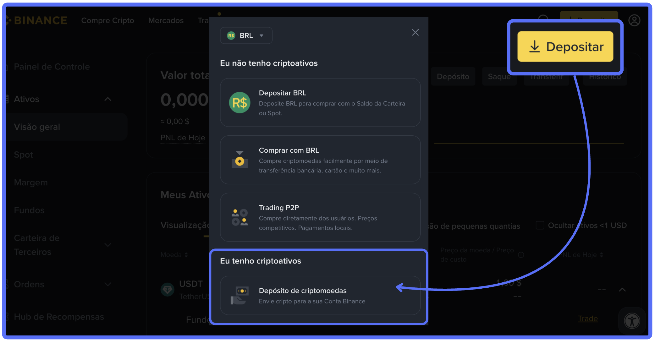 No menu superior, clique em "Depositar" e "Depósito de ciptomoedas"