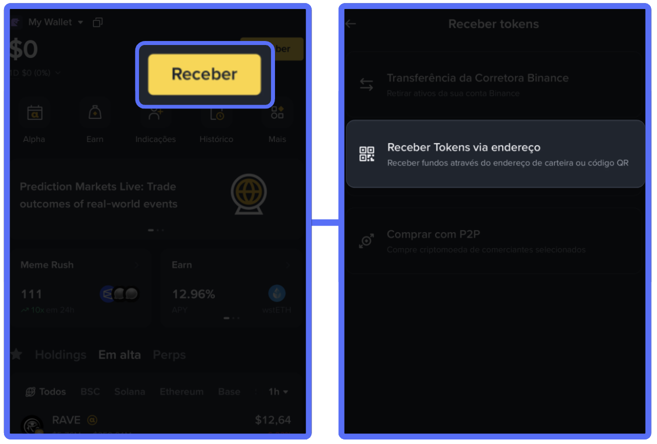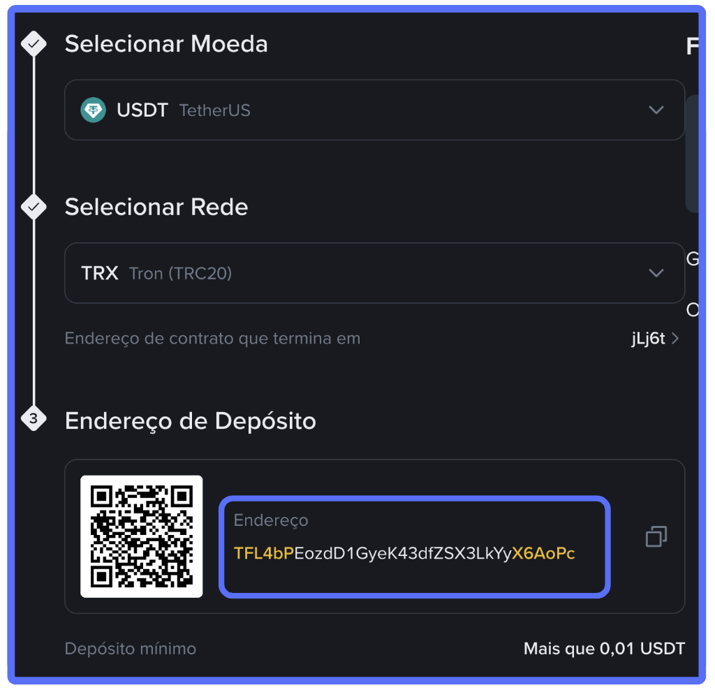 - O endereço da sua carteira será exibido em forma de QR Code e texto
